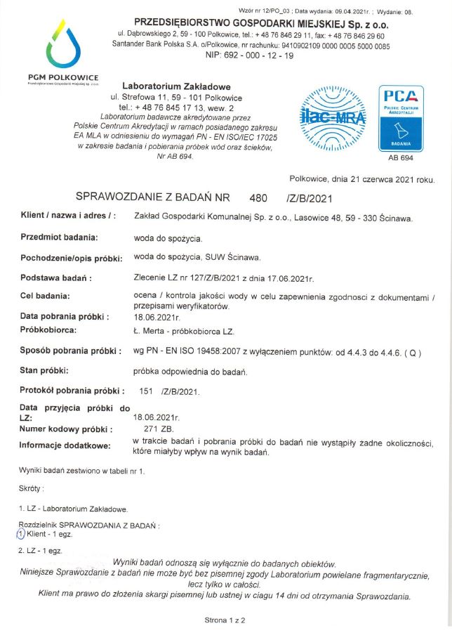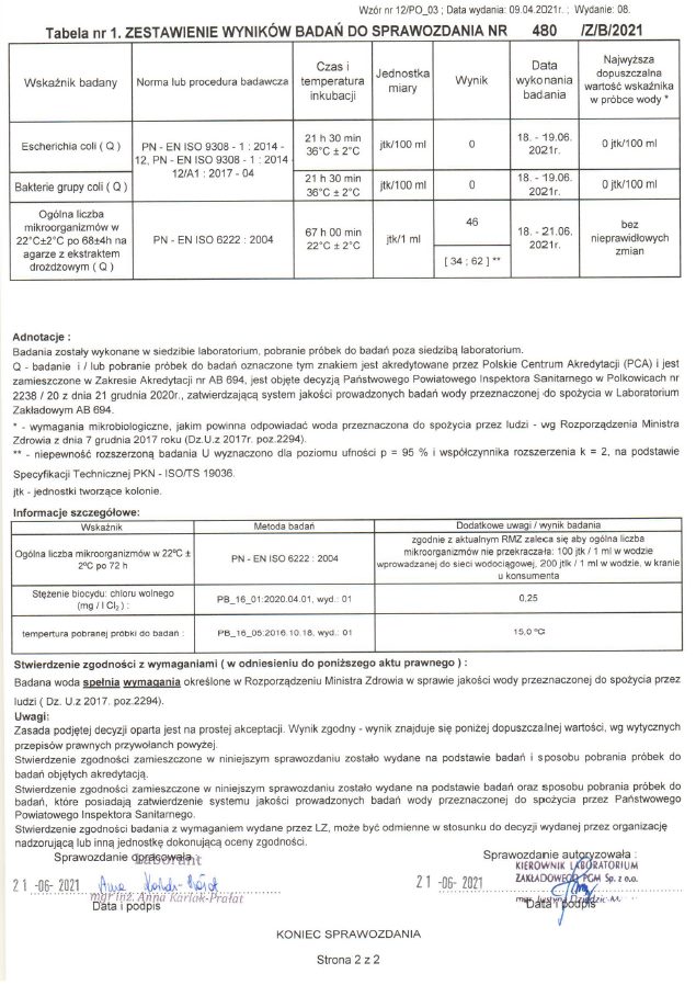 Przedstawiamy w załączeniu najnowsze wyniki badań wody.